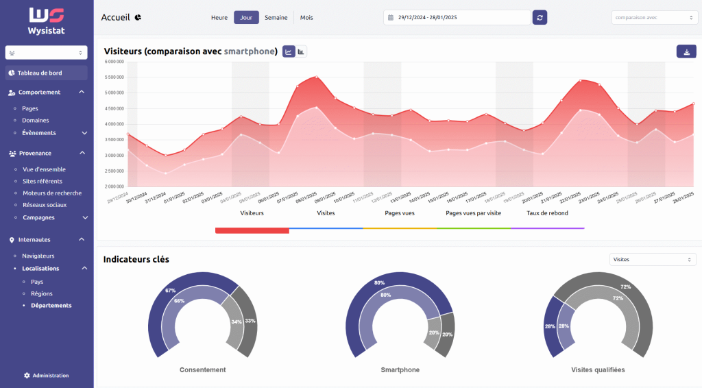 Une analyse du trafic se fait également à partir d’une comparaison : Wysistat va vous permettre de comparer les périodes entre elles, mais également le taux d’utilisation des smartphones, du consentement, …