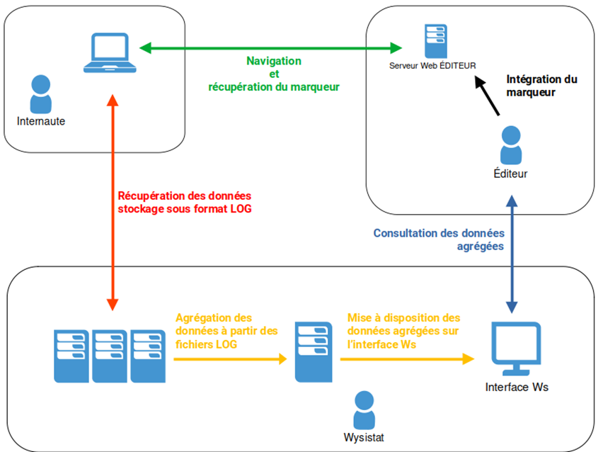 Le marqueur est interprété par le navigateur de vos internautes, dépose un cookie et envoie une requête sur nos serveurs de comptage. Les données d’audience sont alors récupérées, agrégées et affichées sur notre interface.